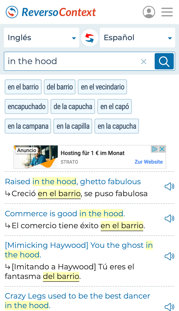 Pero volviendo a las SERPs, hood es “capucha”, pero el resultado de Reverso es “in the hood”, que es “en el barrio” o “encapuchado” según el contexto. Un resultado que responde perfectamente a la intención y mucho más completo que la respuesta de Google.