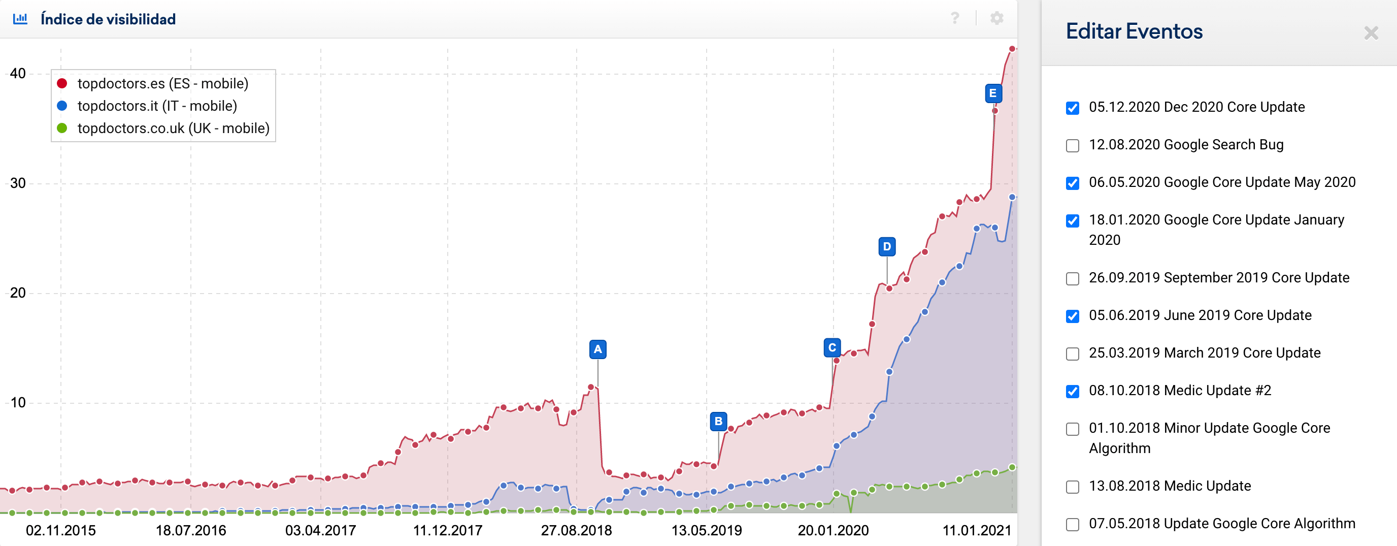 Entre los 100 primeros tenemos tres sitios web médicos que han sabido aplicar y entender a la perfección todos los cambios y valoraciones relacionadas con E.A.T. Entre ellos destaca TopDoctors, cuya estrategia no solo les ha beneficiado en España sinó que en países europeos como Italia han obtenido resultados similares.