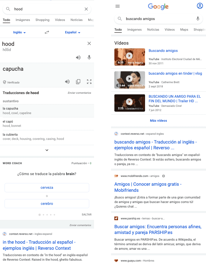 No pasa lo mismo en «inglés a español», donde los resultados tienen más sentido. Si un usuario busca una palabra en inglés, como por ejemplo “hood”, lo lógico es que devuelva una página de traducción.