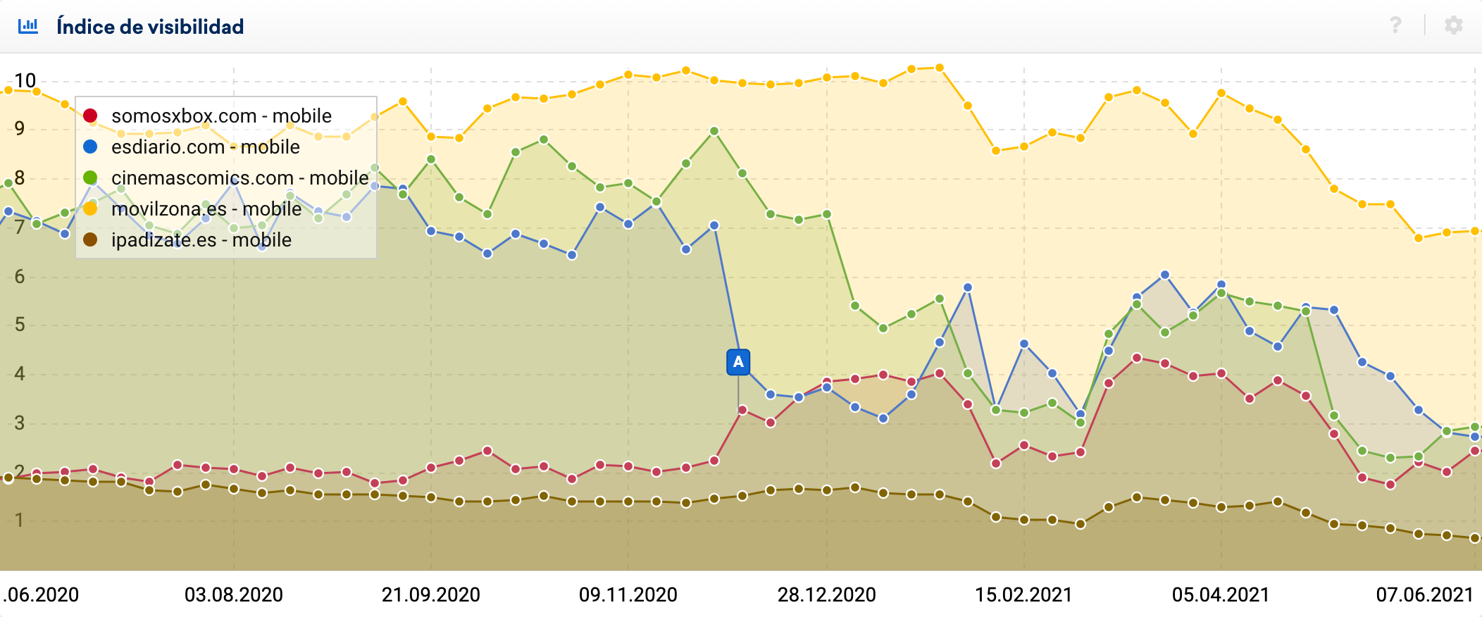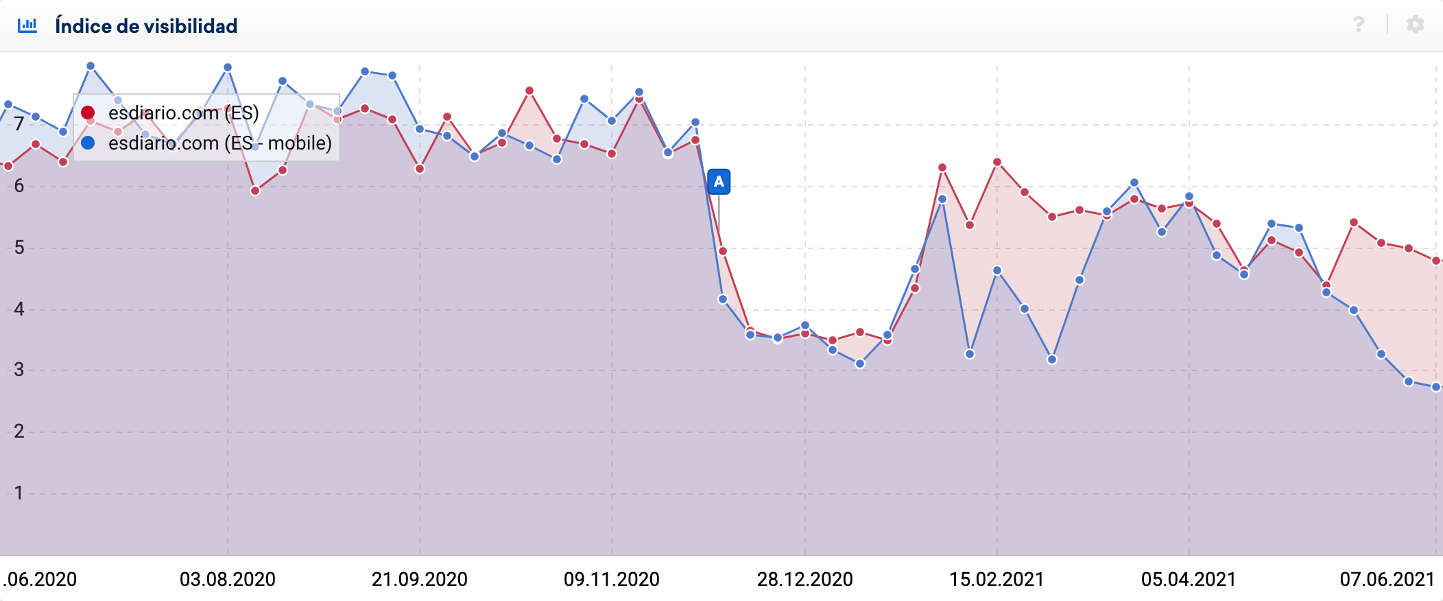 Es muy extraño que la visibilidad para escritorio y móvil de un proyecto tenga estas diferencias, normalmente van paralelas, así que me puse a mirar la lista y encontré otros proyectos con la misma gráfica, entre ellos esdiario.com. No miréis la caída paralela de móvil y escritorio (noviembre 2020), sinó cuando cae para móvil pero no cae para escritorio.