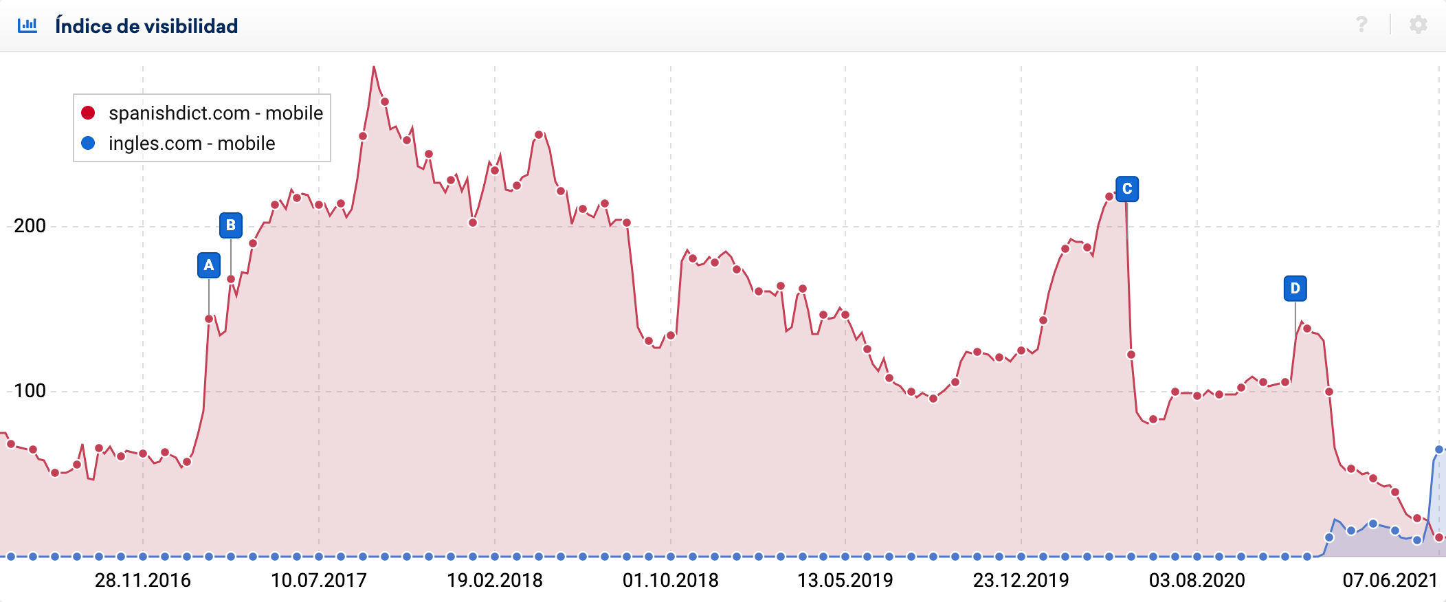 SpanishDict tenía una versión en inglés y otra en castellano. El proyecto resolvía las necesidades de “aprender inglés” y “aprender español” en el mismo proyecto, “mezclando” los contenidos en los dos idiomas, sin una división clara a nivel de arquitectura. Y no les funcionó nada mal durante mucho tiempo, como podéis ver en la gráfica inferior: