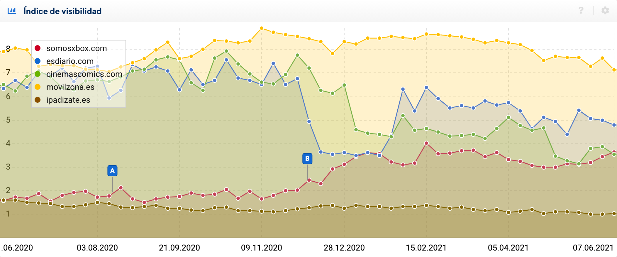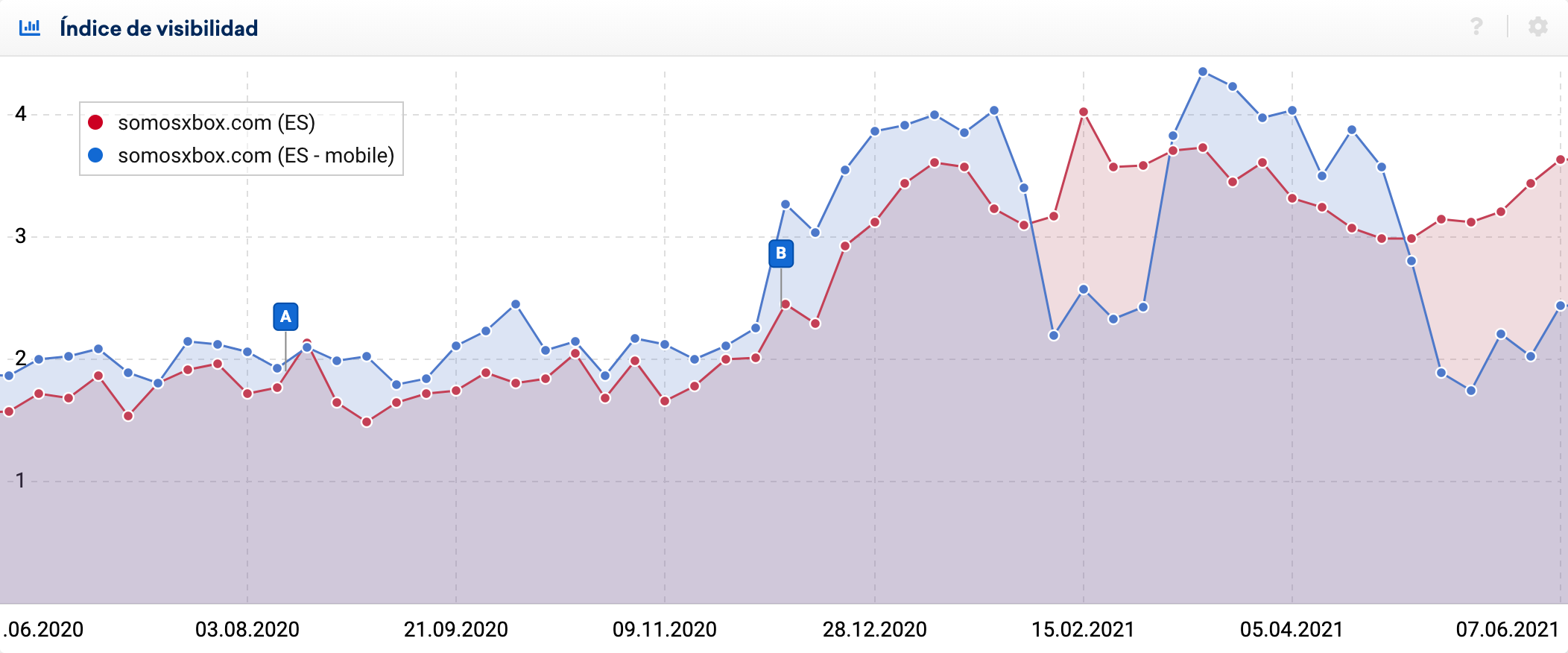 Y por último quiero mostraros una correlación interesante. Mirando la lista me llamó la atención un proyecto somosxbox.com. Cuando entré en el proyecto no parecía tener caída, pero sí aparecía en la lista. Esto es porque la lista es de visibilidad para móvil y el primer gráfico que veis en SISTRIX es la de escritorio. Así que comparé las dos visibilidades y voilà, ahí tenéis la caída.