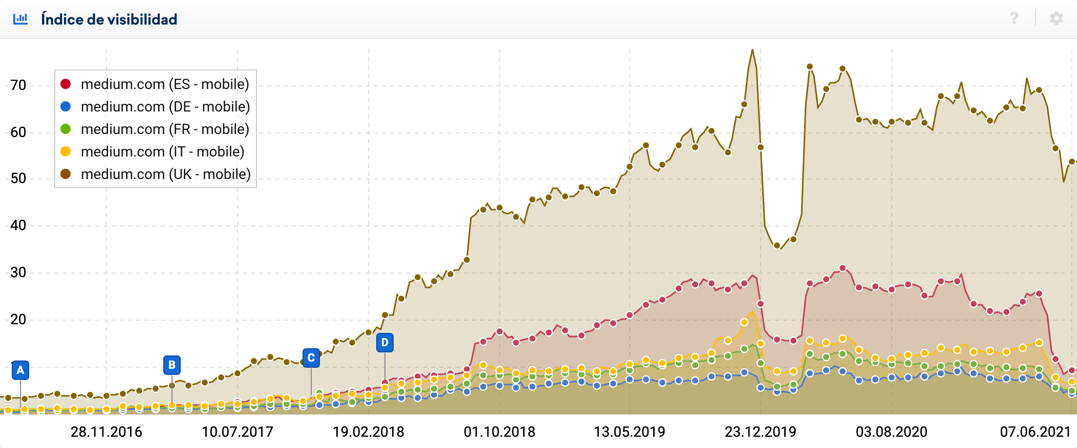 Y sí. Hay varias correlaciones importantes en los últimos meses en su visibilidad para móvil. Hay una caída importante entre el 8/02 y el 1/03 aproximadamente y la última a partir del 19/04 y, aún sigue cayendo mientras escribo estas lineas.