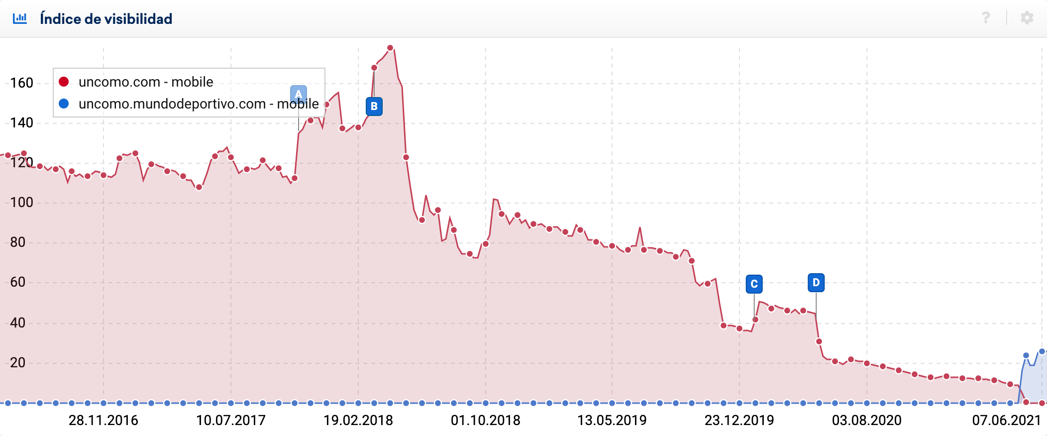 Como podéis ver en el gráfico inferior uncomo.com ha migrado su dominio bajo el paraguas de Mundo Deportivo que lo lleva a nivel SEO la gran María Carrión.