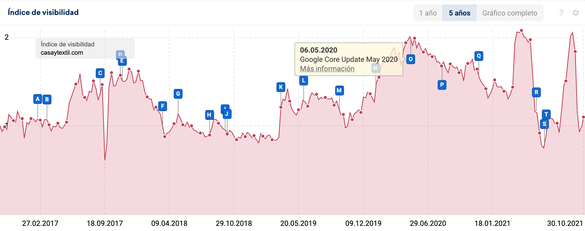 Casa y Textil es un ecommerce de ropa de hogar que aparece listado entre los perdedores porque ha caído un 47% su visibilidad. Mirando el gráfico vemos que esa caída es una corrección a una subida previa y no es “preocupante”. Lo preocupante es que tiene una tendencia bajista importante desde el Core Update de mayo 2020, y eso si me interesa :)