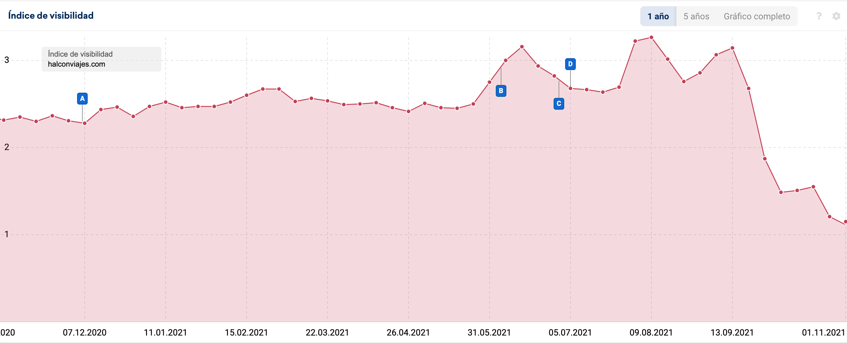 Me aparece Halcon Viajes con una pérdida del 38% en visibilidad, pero lleva en caída dos meses y ha perdido un 50% en total. Y teniendo en cuenta que en 2015 tenía 10 puntos de visibilidad, en diciembre 2016 se hundió y hoy ronda 1,1, tienen un gran problema SEO.