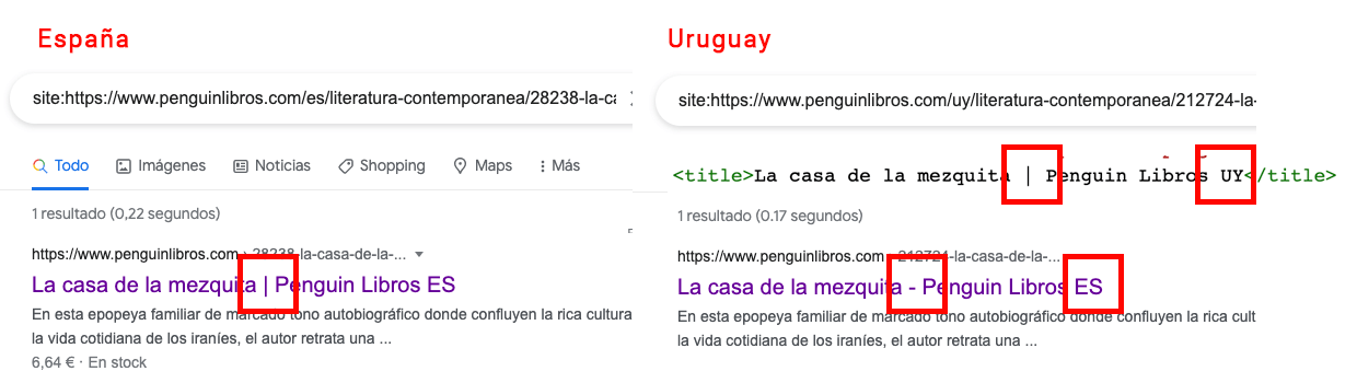 Si miramos la marca que Penguin añade a los títulos son dos diferentes “Penguin Libros ES” y “Penguin Libros UY” y cómo Google cambia el título añadiendo la marca “Penguin Libros ES” a la versión de Uruguay. No puedes inventarte una marca diferente por país. Tu marca es “Penguin Libros” y no deberías incluir jamás una coletilla.