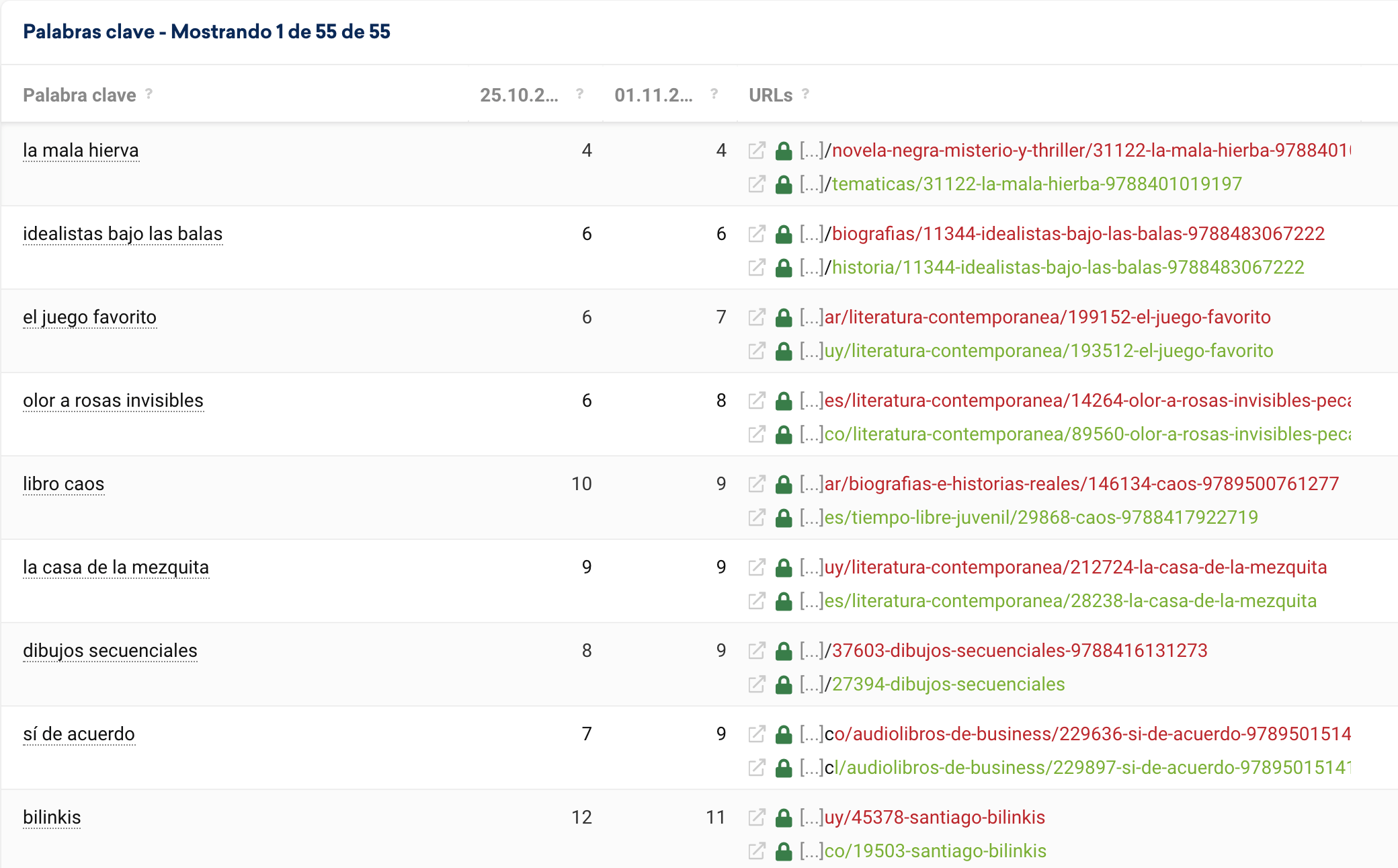 Así de inicio si miramos el listado de URLs que cambian dentro de cada palabra clave nos damos cuenta que tenemos un problema de duplicidad entre países de habla hispana. Podéis ver que muchas URLs que se posicionan son de Uruguay, Colombia, Argentina …