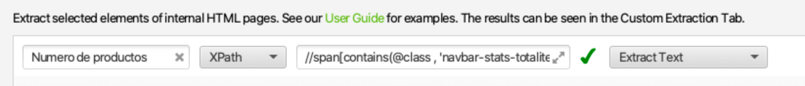 Para comprobar si esto que estoy afirmando es un problema o no hacemos una «scrapeada» con Screaming Frog, configuramos un Custom Extraction ( //span[contains(@class , ‘navbar-stats-totalitems’)] ) para sacar el listado de productos en base al class de la capa contenedora y, booom!!!
