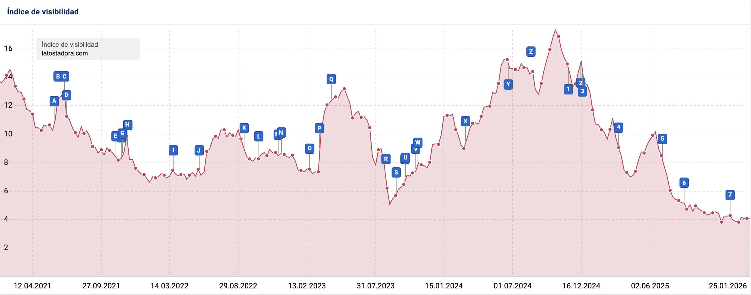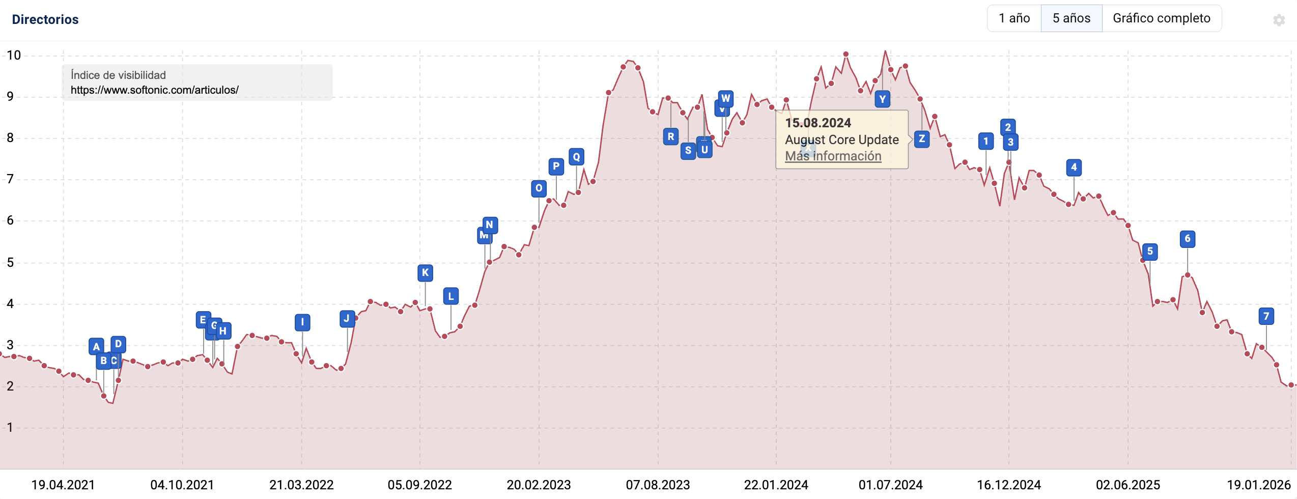 La gráfica es muy clara. Desde el Core Update de agosto 2024 (Z) pierden tráfico, update tras update.