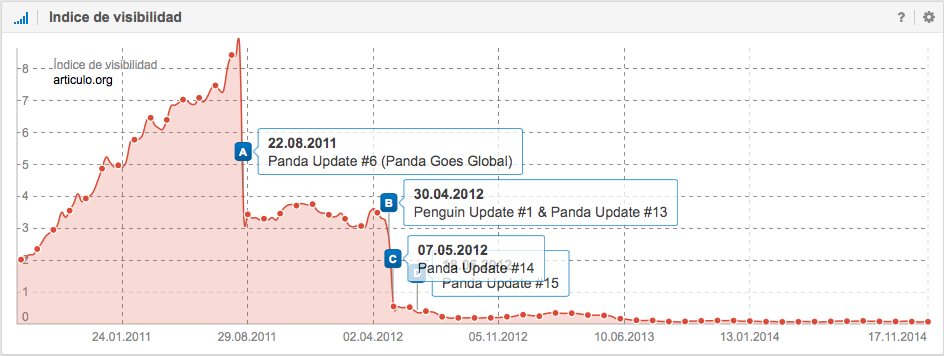 Con las actualizaciones que vinieron a continuación, es decir, la número 13 (Evento B), 14 (Evento C) y 15 (Evento D), articulo.org perdió sucesivamente y con claridad su visibilidad en google.es