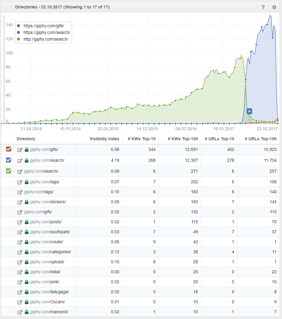 Muy seguramente los SEOs más experimentados habrán descubierto ya la posible causa de pérdida de visibilidad de Giphy.com. Pero primero analicemos diferentes directorios, así podremos ver que no es una penalización a nivel de dominio, pues muchos directorios continúan creciendo en Google: