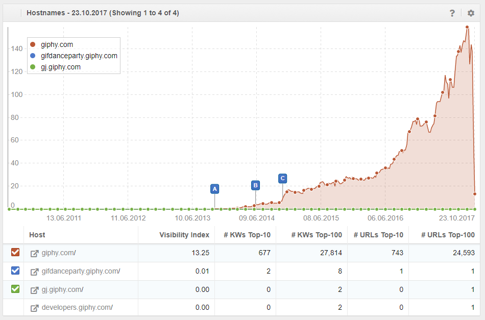Aquí podemos ver que 3 de los 4 Host que tiene Giphy.com, no tienen mucha relevancia en el buscador y además, que la pérdida de visibilidad ha sido en el Host giphy.com/.