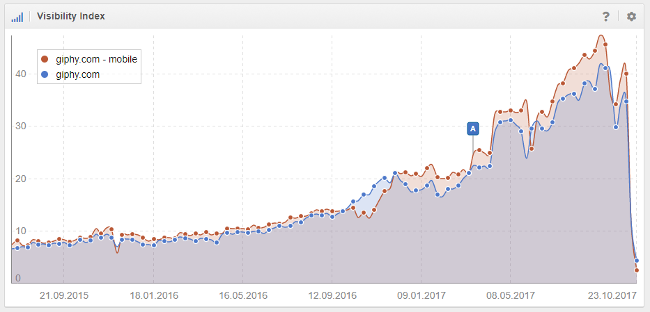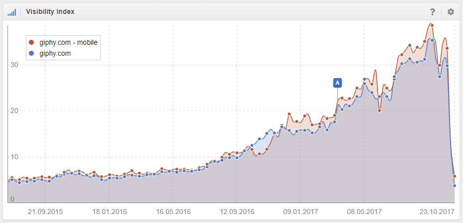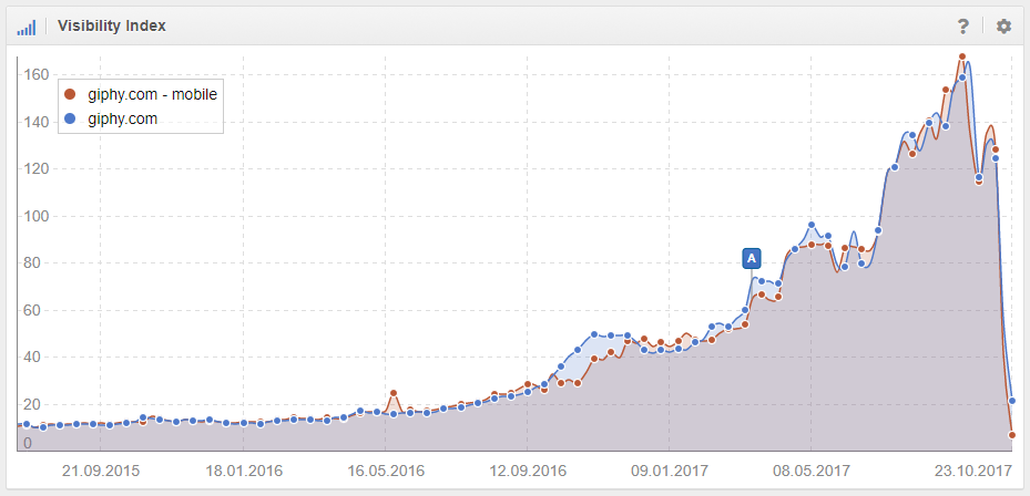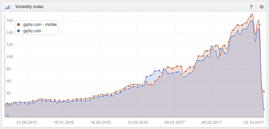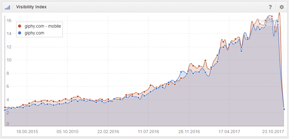 Hace 2 semanas, Barry Schwartz publicó el siguiente artículo: “Giphy CEO: We Own Happy Birthday On Google. Next Day They Get Hit” (CEO de Giphy: Somos los amos de Happy Birthday en Google. Al día siguiente, penalizados) Y así fue. Giphy.com ha perdido visibilidad en los mercados más importantes del buscador. -91% en el Reino Unido, -84 en EEUU, -87 en Francia, -88% en Italia, -83 en Alemania y -85% en España: