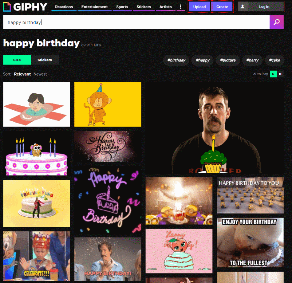 Si escribes “happy birthday” en el campo de búsqueda, Giphy.com creará de forma automática una URL como esta: https://giphy.com/search/happy-birthday – Lo puedes probar tu mismo si deseas. Escribe lo que quieras en el campo de búsqueda y se creará una nueva URL con el término que hayas elegido.