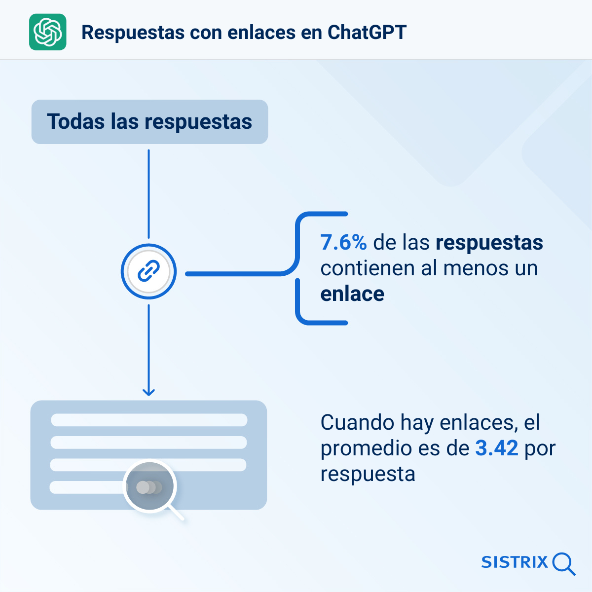 Resultado: En la versión pública de ChatGPT, solo se realiza una búsqueda web en el 7,6 % de las solicitudes. En más del 90 % de los casos, ChatGPT responde únicamente con su conocimiento adquirido. Cuando se muestran enlaces, hay un promedio de 3,42 fuentes por respuesta.