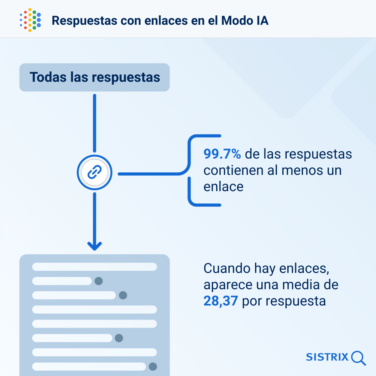 Google AI Mode funciona de forma totalmente diferente: aquí, se realiza una búsqueda web en el 99,72% de las indicaciones. Y las respuestas contienen un promedio de 28,37 enlaces, más de ocho veces la cantidad en comparación con ChatGPT.