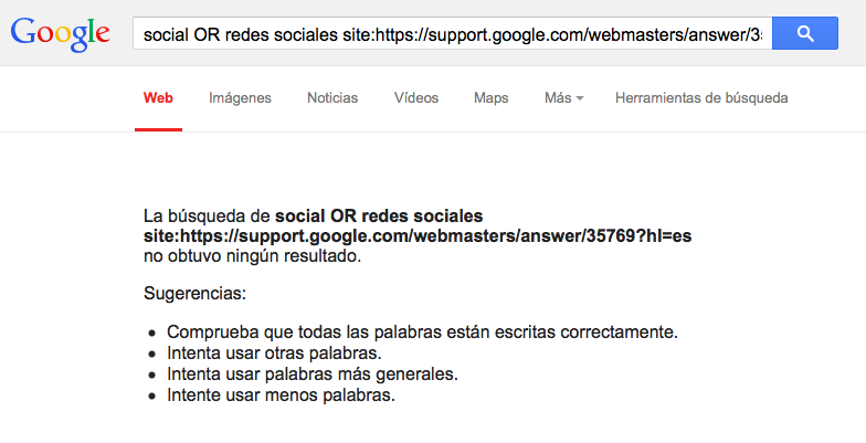 Como era de esperarse, no he ahorrado energía ni costes para llevar a cabo el siguiente estudio que demostrará la influencia de las redes sociales como factor SEO: Buscad en la directrices de Google algún documento que contenga la palabra „social“ o „redes sociales“. El resultado lo veis en esta captura de pantalla y es claro, ninguno de los 2 términos figuran en la directrices: