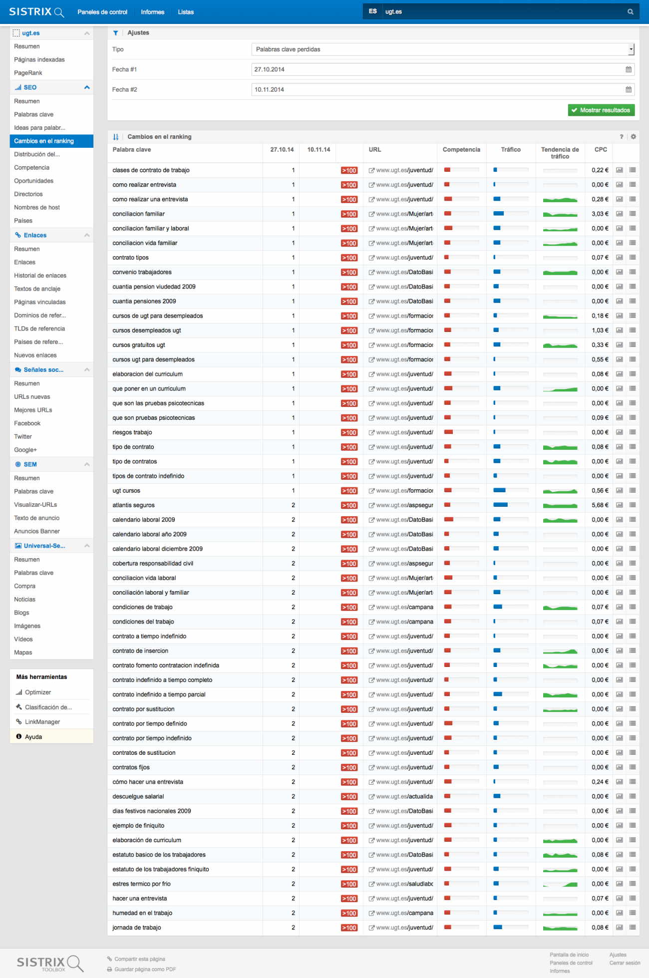 Cuando hay cambios tan claros en el índice de visibilidad y estos han sido generados por la actualización del algoritmo de Google (Panda o Penguin), la herramienta SISTRIX enseña automáticamente en la gráfica estos eventos, pero este no es el caso de la UGT. Por eso investigamos si se ha llevado acabo algún tipo de cambio en la página web o un relanzamiento de esta y efectivamente nos encontramos con esta noticia de EuropaPress: “UGT remodela su página web, configurada como un periódico digital“