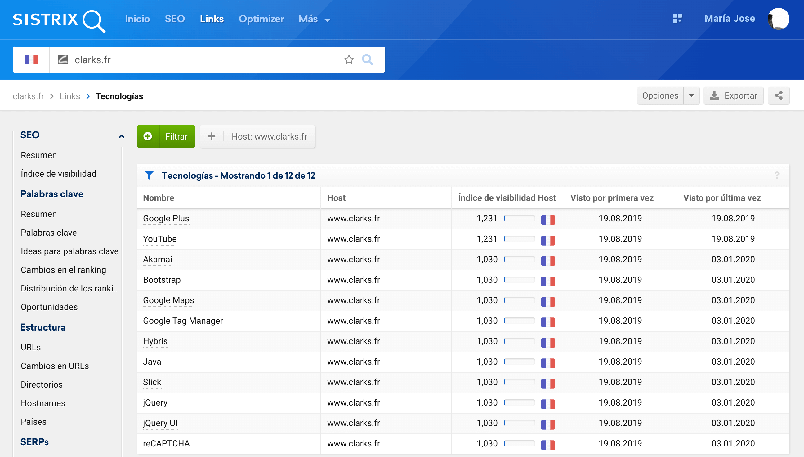 Con la funcionalidad de detección de Tecnologías de SISTRIX, en el módulo de Enlaces, podéis ver qué tecnologías usaban antes de migrar, para cualquier dominio y cualquier mercado, usando las fechas en las que la tecnología se ha detectado para analizar cuándo dejan de usar una tecnología y cuándo empiezan a usar otra.