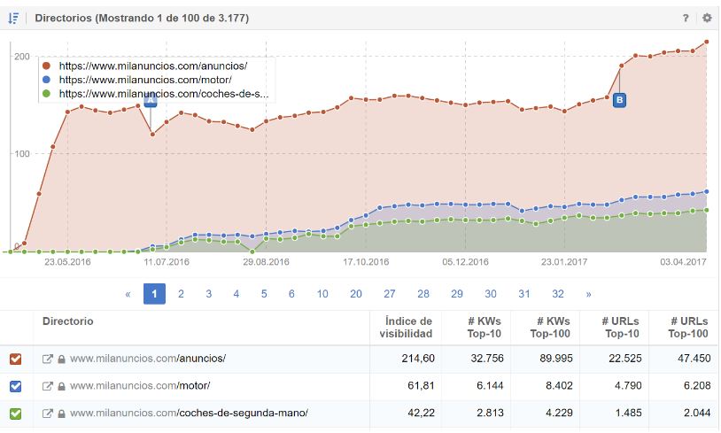 Si analizamos este dominio de una forma más especifica, observamos que los directorios con más visibilidad son www.milanuncios.com/anuncios/ (214,60) www.milanuncios.com/motor/ (61,81) www.milanuncios.com/coches-de-segunda-mano/ (42,22)
