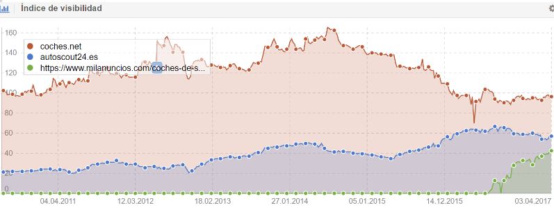 A pesar de la gran visibilidad de milnuncios.es en Googel.es, en este sector “compra y venta de coches” tiene una visibilidad más baja en comparación a sus competidores.