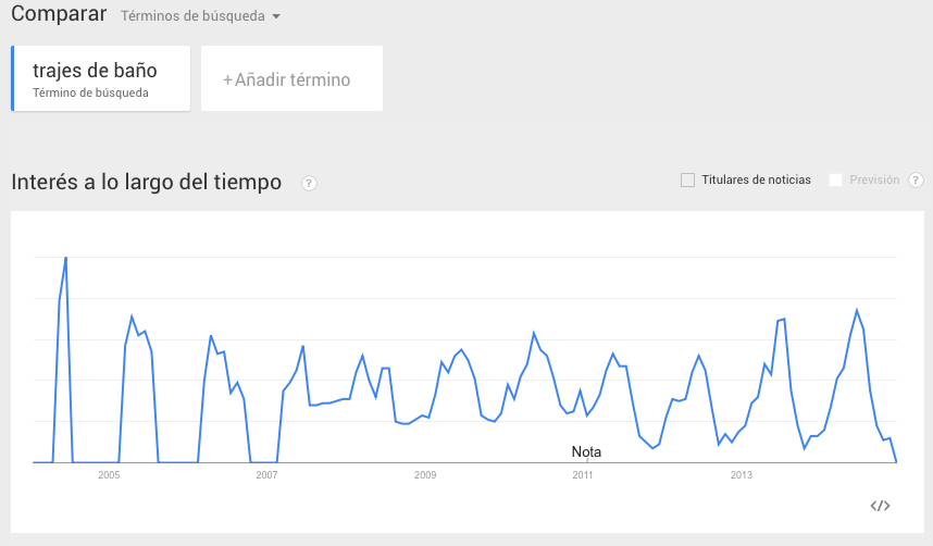 La siguiente gráfica de Google Trends enseña la evolución del interés por la palabra “trajes de baño“ en España en los resultados de búsqueda.