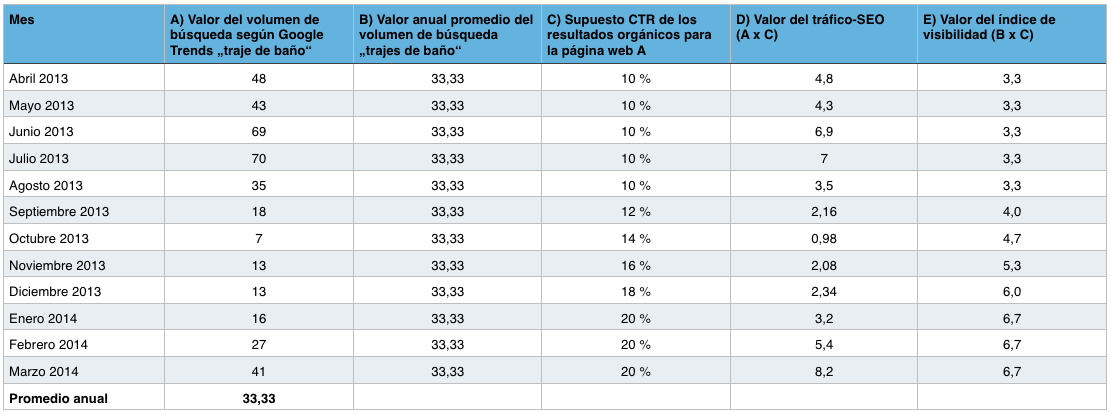 Los supuestos valores del CTR también los introducimos en nuestra tabla. Si deseáramos calcular el índice de tráfico-SEO para este sitio Web, con los datos que disponemos para la palabra “trajes de baño“, tendríamos que tomar los valores de Google Trends para cada mes (columna A) y multiplicarlos por el supuesto CTR (columna C); el resultado lo introducimos en la columna D.