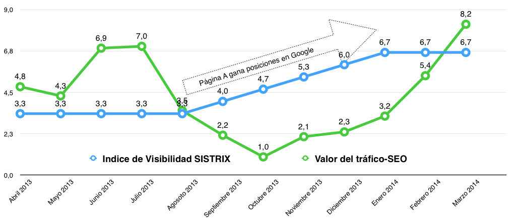 La diferencia entre los cálculos del tráfico SEO y del Índice de Visibilidad de SISTRIX se puede ver claramente en la siguiente gráfica. El índice del tráfico SEO -evidentemente- refleja mejor el tráfico SEO, mientras el índice de visibilidad refleja los cambios en el ranking de Google, es decir, el éxito de la medidas SEO.