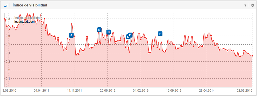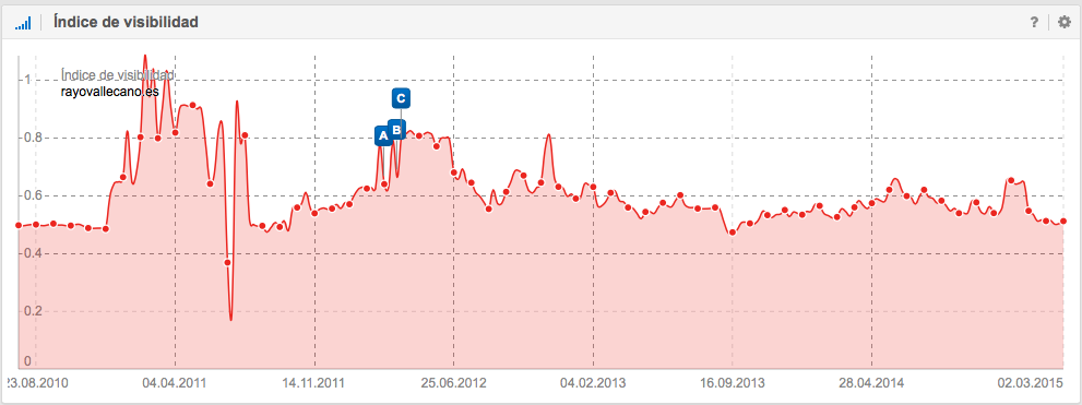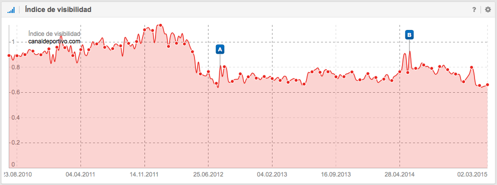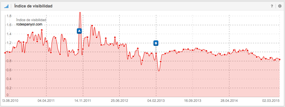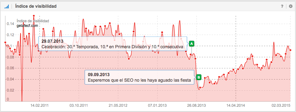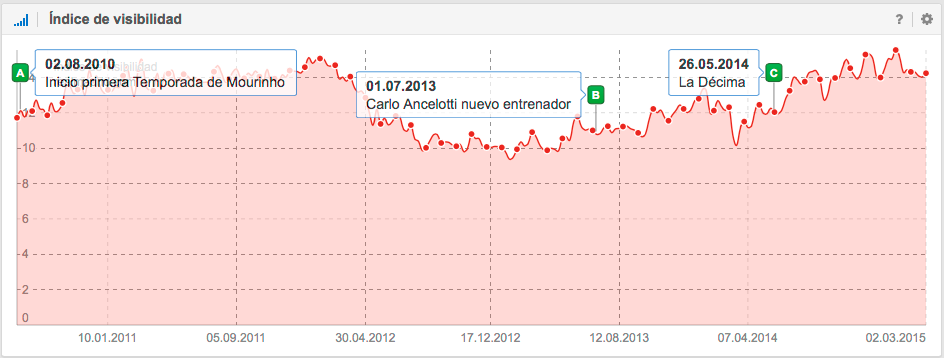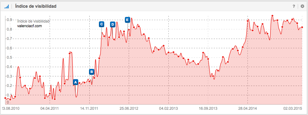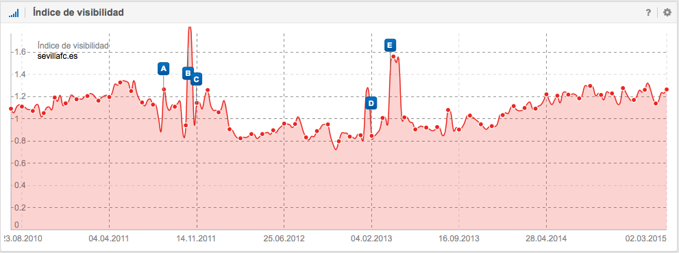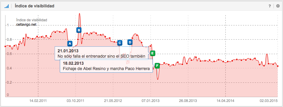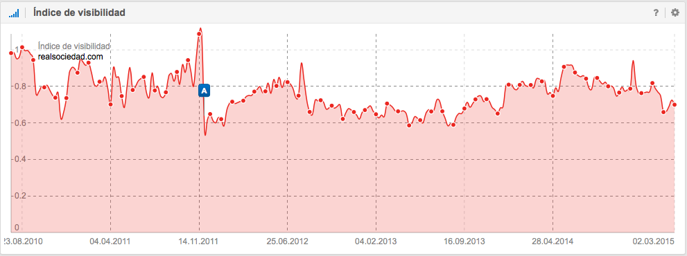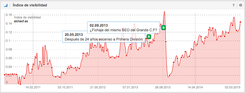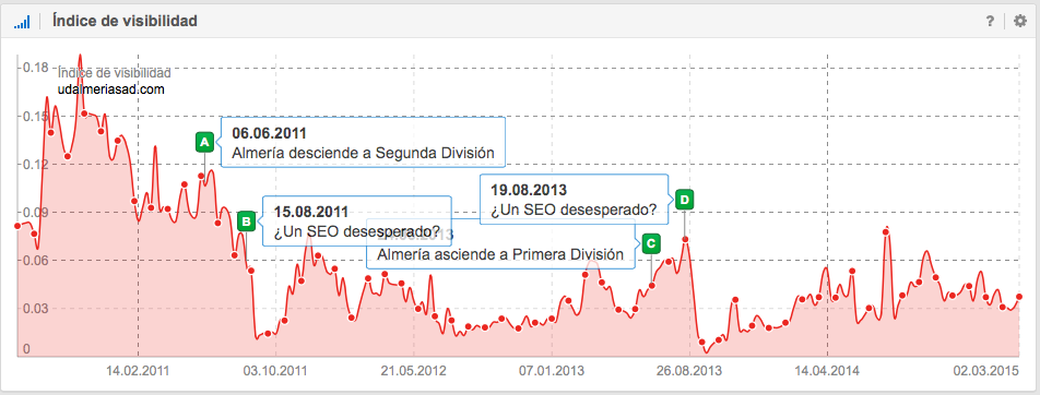A nivel SEO, también es interesante la historia del Unión Deportiva Almería, que ascendió a Primera División en la temporada 2006-2007 donde permaneció 4 temporadas y justo después de perder la categoría en junio de 2011, empieza a descender su visibilidad en Google. Las causas pueden ser como por ejemplo, la perdida de mención en periódicos, en diarios deportivos, en artículos sobre la Liga, en foros, en Blogs, etc., es decir, la pérdida de señales del usuario.