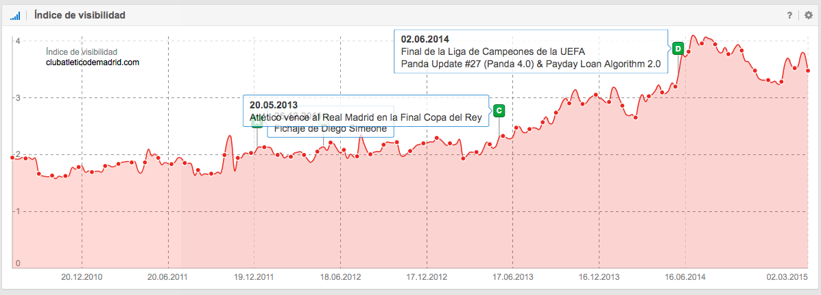 La participación en 4 competiciones diferentes durante los últimos años le otorgó al Atlético mucha publicidad y atención general. Este fenómeno es el resultado generado por las señales que emite el usuario, por el volumen de búsqueda, por todos los artículos en periódicos, en diarios deportivos, en listas de clasificación, en artículos en Wikipedia, etc. que se generan continuamente a partir de los éxitos deportivos. También su forma fresca de jugar al fútbol la habrá beneficiado transformándose seguramente en nuevos seguidores.