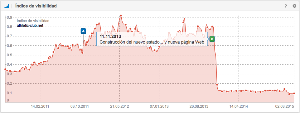 No sabemos si la marcha de Javi Martínez al Bayern de Múnich la temporada anterior o si el hecho de que Fernando Llorente decidiera no renovar su contrato el día 1 de julio de 2013, afectaron al SEO del Athletic Club, o si quizás usaron los pilares de la página Web para sostener el nuevo estadio de San Mamés (inagurado el 16 de septiembre de 2013), el hecho es que el nuevo diseño confinó al Athletic Club a estar en esta posición de la tabla. Quizás el SEO se haya ido de copas con el SEO del Granada, del Elche, del Alemeria y del Getafe (el siguiente candidato) y todos 4 usasen los 301-Redirects como forma de pago en el Bar. Lo que sí es realmente seguro, es que este cambio le ha costado al Athletic un 85% de visibilidad en Google, visibilidad que hasta el día de hoy no han sabido recuperar. A continuación veréis la pérdida de Backlinks por mal redireccionamiento del la página Web del Athletic Club: