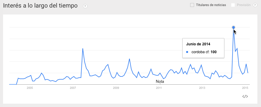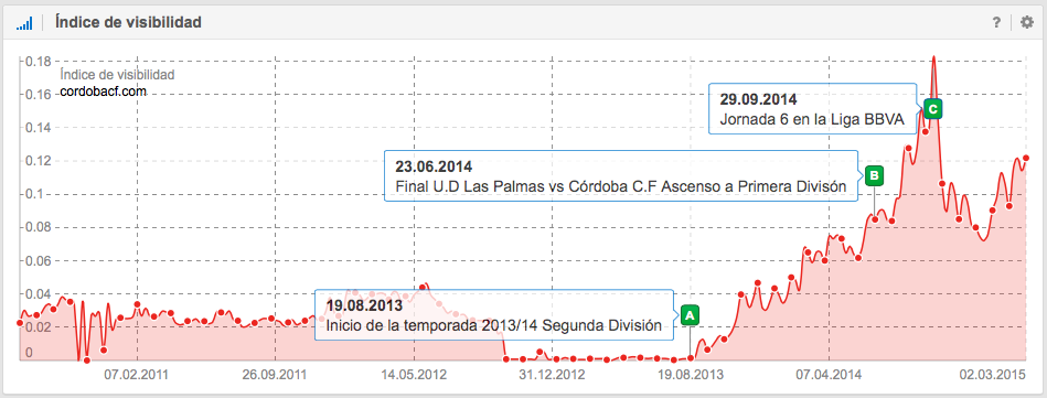 El día 22 de junio de la temporada 2013/14 y después de 42 años regresó el Córdoba C.F. a Primera División de fútbol española. Es interesante ver cómo con el aumento de la expectación generada a medida que el club se acercaba a su clasificación, aumentaba también su visibilidad. Una vez clasificados en Primera División, se puede observar en el inicio de la temporada 2014/15 otro aumento de visibilidad, cuyo cúspide duraría hasta la sexta jordana (después de 3 derrotas y 3 empates), pero la tendencia continua siendo positiva.