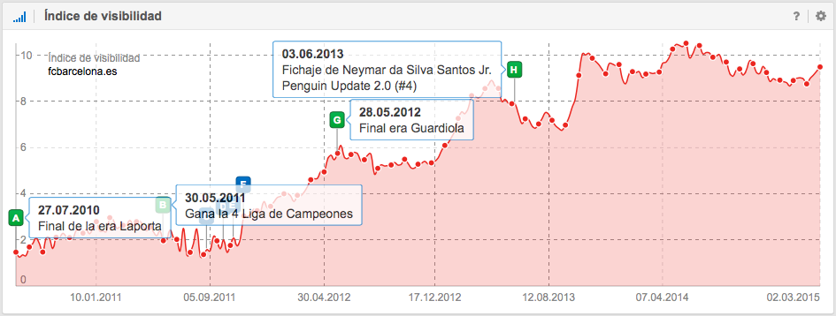Para los amantes de fútbol y del SEO, hoy os presentamos un artículo diferente en el cual valoraremos la visibilidad de los últimos 4 años en google.es de aquellos clubs de Fútbol que actualmente juegan en la Liga BBVA (La Primera División Española). Durante la lectura veréis cómo Google detecta con rapidez las señales que emiten los usuarios y la forma en que las refleja en sus resultados de búsqueda. En general cabe destacar que el éxito en Google esta ligado al éxito deportivo. Aquellos clubs que lideran deportivamente también lideran en Google y aquellos clubs que han podido conservar su clase durante los últimos años en el centro de la clasificación, tienen una visibilidad bastante horizontal. La mayoría de clubs que han luchado por la permanencia, por una plaza en alguna competición Europea o que han ascendido y descendido, tienen mucho que contar. Por ese motivo hemos elegido los casos más interesantes en google.es durante los últimos 4 años y analizado las causas con seriedad y un poco de ironía.