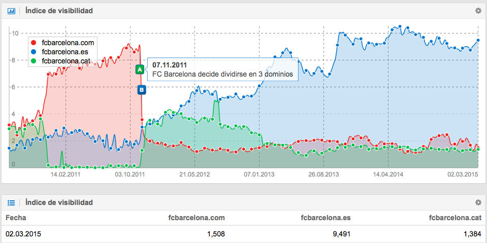 En general el SEO del FC Barcelona también realiza un buen trabajo, pero incomprensiblemente el club usa 3 dominios para 3 idiomas diferentes: fcbarcelona.es, fcbarcelona.com, fcbarcelona.cat. Y decidió hacerlo cuando las cosas iban bien y su visibilidad aumentaba. En pocas palabras, es como si el FC Barcelona distribuyera hoy mismo los jugadores de su primer equipo en 3 equipos diferentes: Primera División, Segunda División y Segunda División B. Hacer uso de esta estrategia sólo lo debilita. Y tanto en fútbol como en SEO (y especialmente en este caso), 1+1+1 no es igual a 3. Si hacen uso de un sólo dominio tendrían una visibilidad superior a la suma de los 3 dominios, es decir, x > 12,383 puntos.