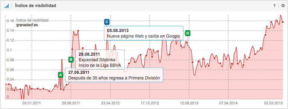 El 18 de Junio de 2012 y después de 35 años regresó el Granada C.F a Primera División (y con ello, también su visibilidad en google.es.), donde se ha logrado mantener hasta el día de hoy. Lo mismo no sucede con su presencia Web, cuyo diseño renovaron en verano del 2013. Una vez clasificados en Primera División, se puede observar en el inicio de la temporada 2011/12 otro aumento de visibilidad. Lo normal es un aumento de la visibilidad a principio de temporada, como lo hemos comentado antes, ya que aumenta el interés, las publicaciones, etc., pero en la temporada 2013/14 al Granada le sucede justo lo contrario, aparentemente después de rediseñar la página Web el SEO se dejó los 301-Redirects en el bar.