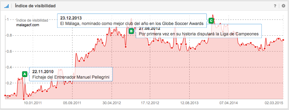 Una de las historias más bonitas. Durante el mes de noviembre de 2010 se anunciaba la contratación de Manuel Pellegrini como nuevo entrenador del Málaga Club de Fútbol. Con él llegarían los momentos históricamente más importantes del Club durante las temporadas 2011/12 y 2012/13 cuando el Málaga C.F. obtuvo el pase y disputó por primera vez la Liga de Campeones de la UEFA. Los efectos del desarrollo futbolístico de este Club se reflejan claramente en su índice de visibilidad, que se ve positivamente afectado por su popularidad, la atención generada, por las noticias, los blogs, las páginas de Fans que hablan sobre los éxitos del Club en las 3 competiciones en las cuales participó.