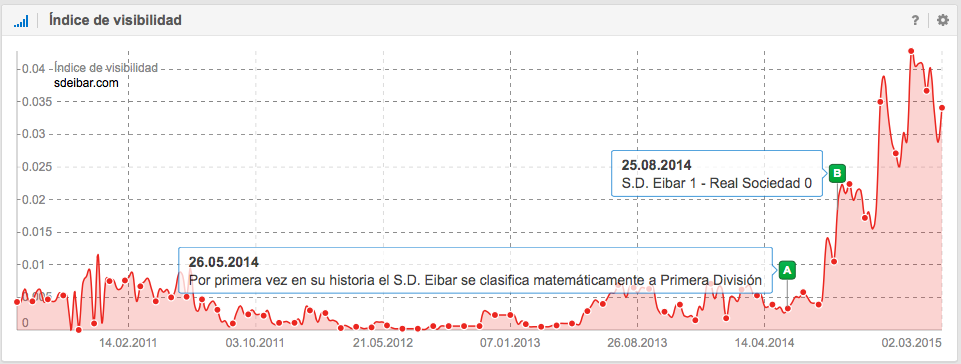 Sin duda alguna S.D. Eibar (de Éibar en Guipúzcoa), ha sido una sorpresa positiva tanto en la Liga como en google.es. A pesar de que este modesto Club sea el último de la Clasificación histórica de la Primera División de España y que su nombre fuese casi totalmente desconocido para muchos, ha generado mucha expectativa tanto en Primera División como en google.es (donde seguramente continuará aumentando su visibilidad). El punto definitivo de partida fue justo después de que por primera vez en su historia se clasificará en Primera División y como en casos anteriores, justo antes del inicio de la temporada, cuando todos hablan de la Liga, empiezan a subir en google.es hasta su primer debut, donde duplicó la visibilidad. Seguramente era una victoria significativa: El 29.08.2014 venció a la Real Sociedad 1-0.