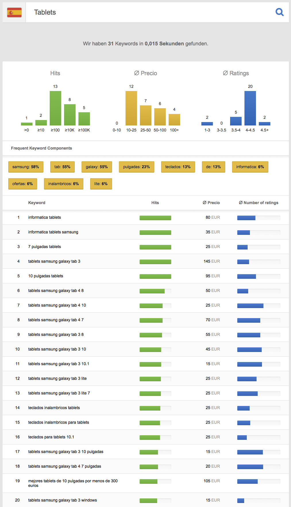 Evidentemente el comportamiento de búsqueda es diferente al de Google. La intención de búsqueda del usuario es normalmente una intención de compra, que pasa por un modelo diferente de SERPs y finaliza una y otra vez, en la palabra clave. Para obtener un poco más de transparencia, hemos creado una base de datos para la búsqueda en Amazon. Esta Amazon Keyword Tool posee varios millones de términos de búsqueda, sobre todo los más comunes, por ejemplo, Tablets:
