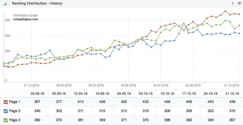 Además, en la siguiente gráfica, podemos ver cómo el número de palabras clave de la primera, segunda y tercera página de los resultados va en aumento (En la herramienta se pueden ver las 10 primeras páginas). Es decir, que los resultados de búsqueda de este dominio se están movilizando desde atrás hacia las primeras páginas: