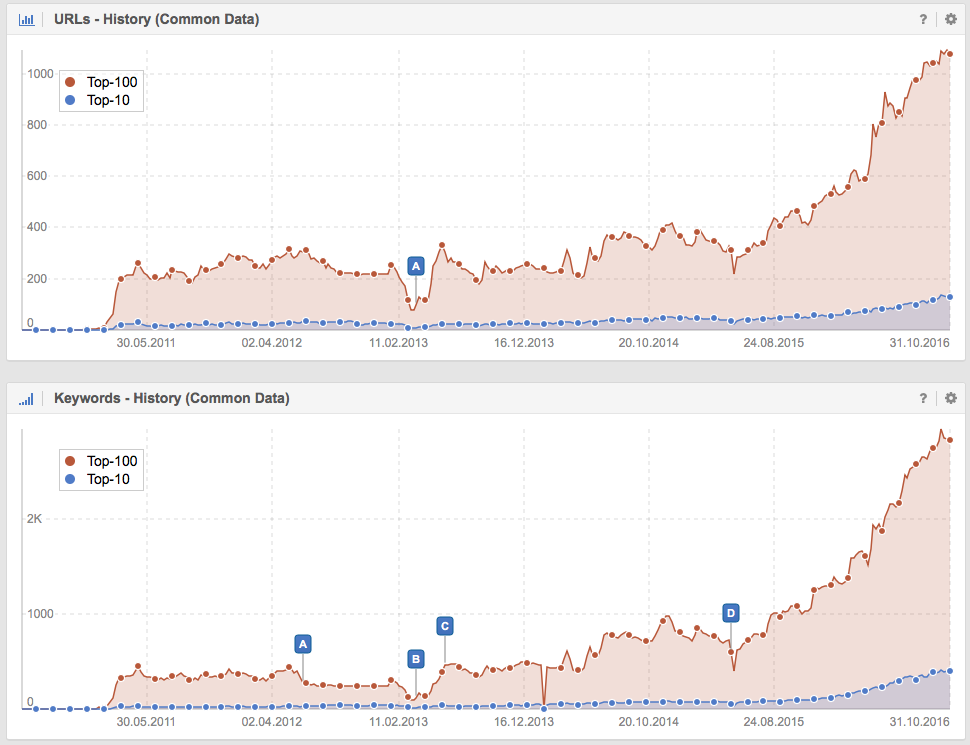 Ahora, aunque el número total de documentos indexados ha aumentado un 35% (de 5.490 a 7.450 URLs), el número de URLs posicionadas ha aumentado más de un 300% y el número de palabras clave más de un 500%. El número de URLs en el Top-100 pasó de 327 a 1.080 y en el Top-10 pasó de 39 a 127 URLs. El número de palabras clave del Top-100 pasó de 724 a 2.830 y en el Top-10 de 76 a 400 palabras clave.