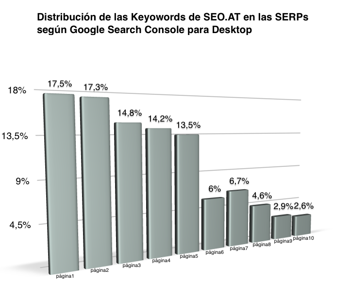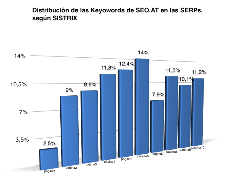 Por principio, Search Console solamente entrega datos si existe un mínimo de impresiones (desgraciadamente Google no ha definido éstas con exactitud). Las consecuencias se pueden observar mejor haciendo uso de un ejemplo. Esta es la distribución de seo.at (el portal de noticias SEO más famoso en los países germanohablantes), en las SERPs de Google basándonos en nuestra herramienta SISTRIX: