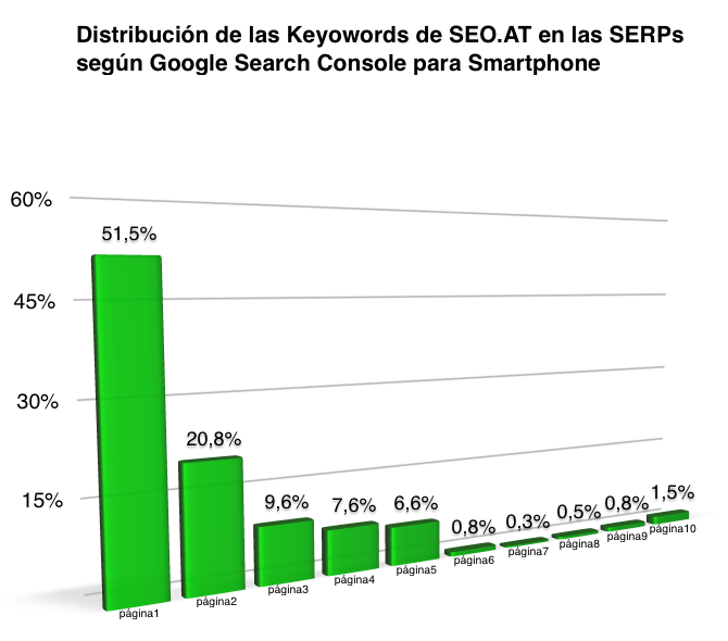 Cómo podemos ver, el resultado es totalmente diferente. La mayoría de palabras clave se posicionan en la primera página según Search Console. ¿Significa esto que todo está bien y no me debo preocupar? ¡Conclusión errónea! El problema yace en la forma en que Search Console recopila los datos: Google solamente deja circular datos que poseen un número determinado de impresiones generadas por los usuarios. Es decir, los resultados dependen del comportamiento del usuario hacía ese dominio en los resultados de búsqueda. Más claro aún, se ve cuando en lugar de analizar los datos de Google Search Console para Desktop, los analizamos para Smartphone: