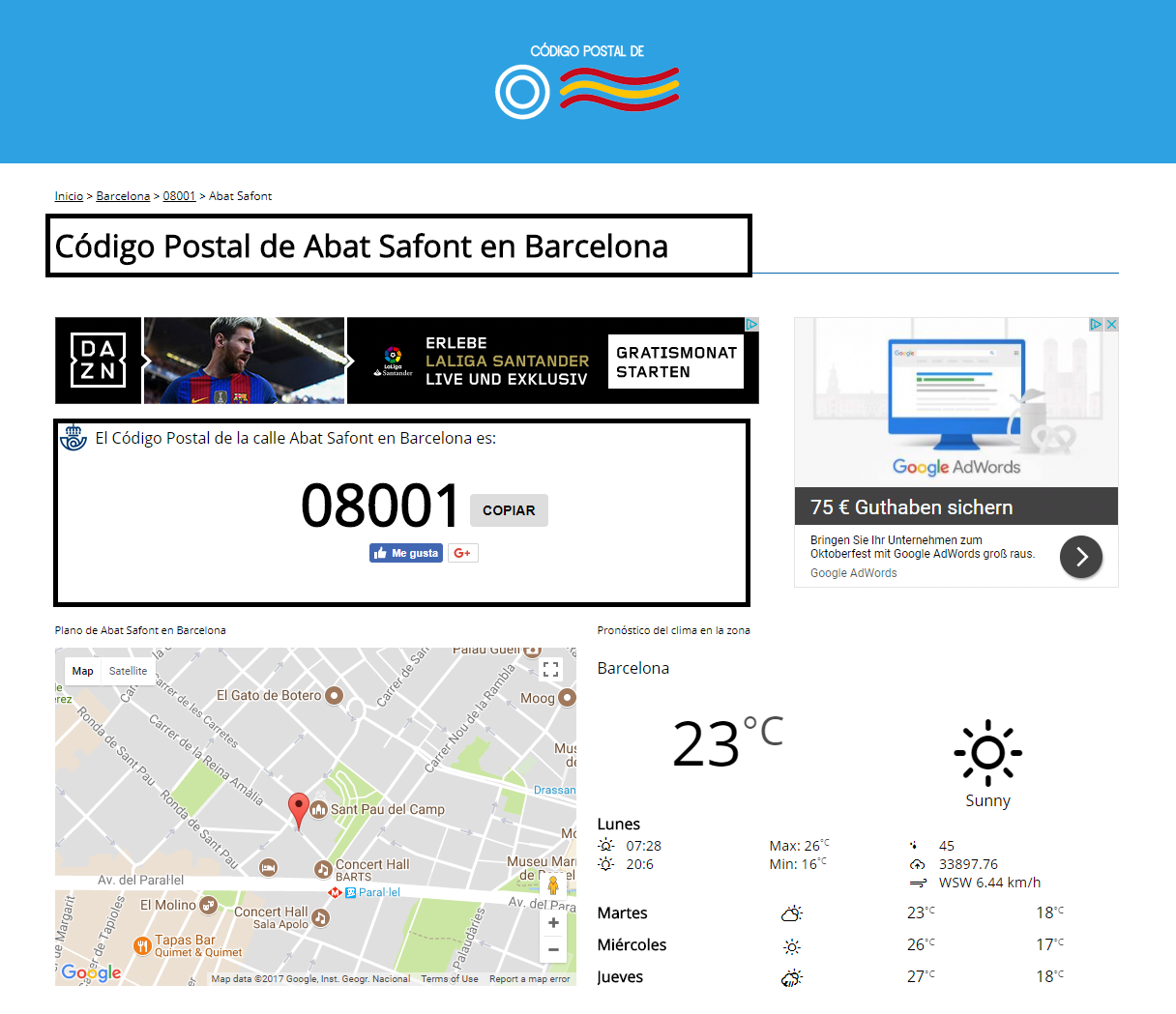 Nota: Codigopostalde.es no es el único dominio que ofrece este servicio. Codigo-postal.info, es más antiguo, tiene más visibilidad y su desarrollo también es impresionante, pero los pantallazos no eran buenos para ser usados como ejemplo y tampoco cayó en 2 filtros de calidad.