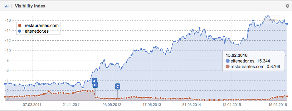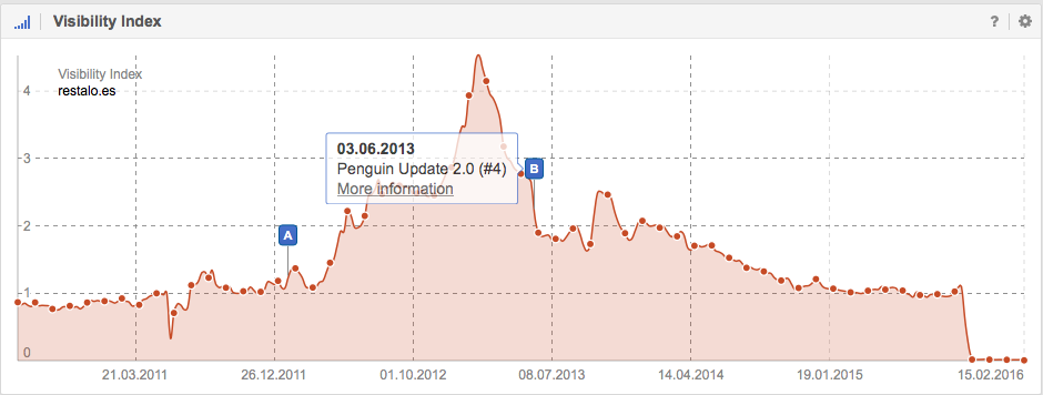 Se podría concluir que durante los últimos 6 años no se han adoptado otras medidas (además de los enlaces), que pudiesen contribuir a mejorar la visibilidad de Restalo.es en Google. Esta información es importante conocerla, antes de tomar otro tipo de desiciones, pues nos sugiere que los tornillos a ajustar, podrían ser otros.