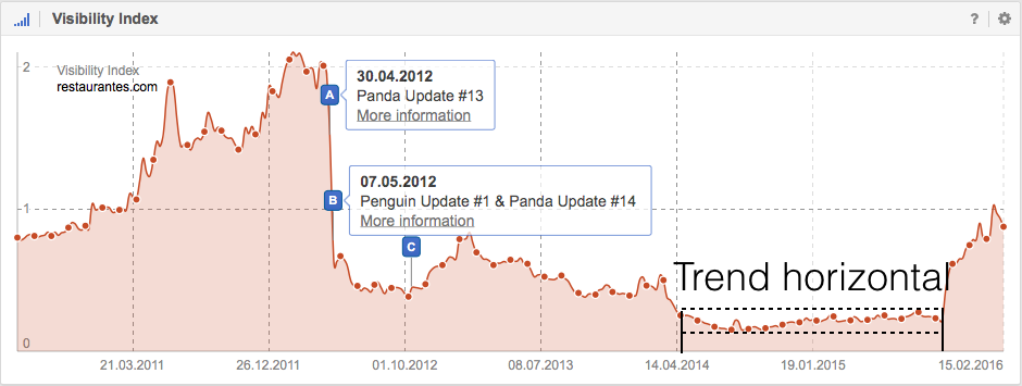 De entrada podemos ver que la calidad de contenidos ofrecidos por este dominio no era la mejor y quizás fue penalizado por Panda #13 y Panda #14 y nunca más se recuperaron, pues la visibilidad después de la penalización, nunca llegó a ser superior. Esto también podría explicar por qué su trend de su visibilidad estaba en mínimos históricos antes de ser adquirido: