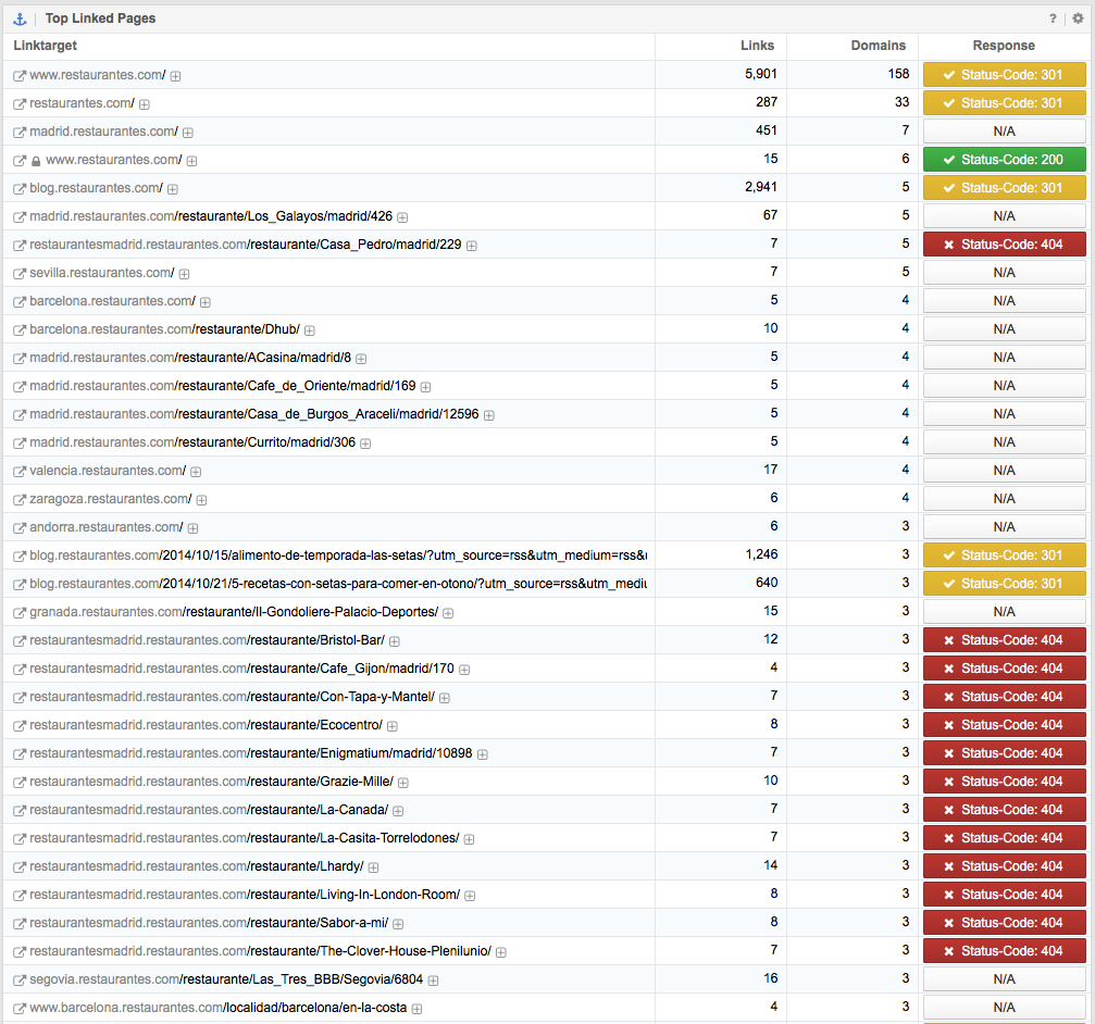 Los enlaces externos de Restaurante.com se desperdician a pesar de que su contenido era muy similar al nuevo. Estos se podrían redirigir a través de un 301-Redirect al nuevo contenido y así obtener un poco más de visibilidad.