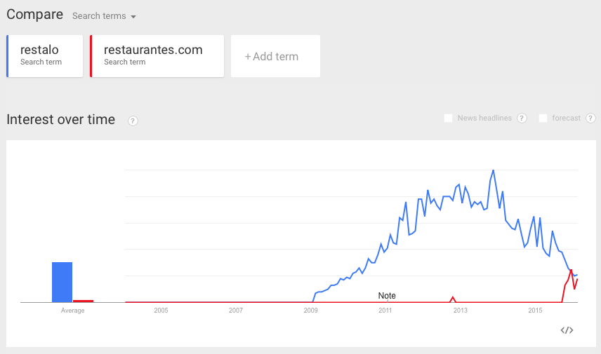 - No sé si se ha llevado acabo un estudio de Marketing sobre la marca “Restalo“ que les ha motivado comprar “Restaurantes.com“. En la siguiente gráfica se puede observar que los usuarios han dejado de buscar activamente la marca “Restalo“, un indicio importante que mide la insatisfacción del usuario: