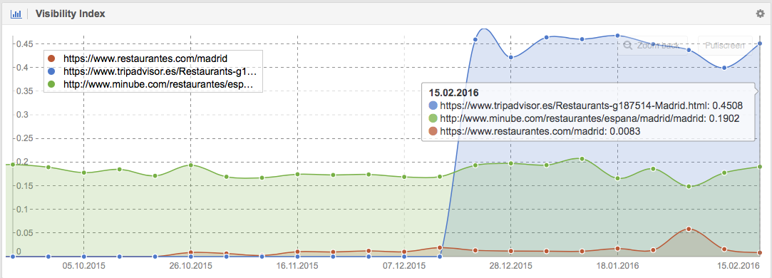 Otro ejemplo, si comparamos las URLs que se posicionan para “restaurantes madrid“, veremos que la URL de Tripadvisor tiene 54 veces más visibilidad en Google, que la URL de Restaurante.com: