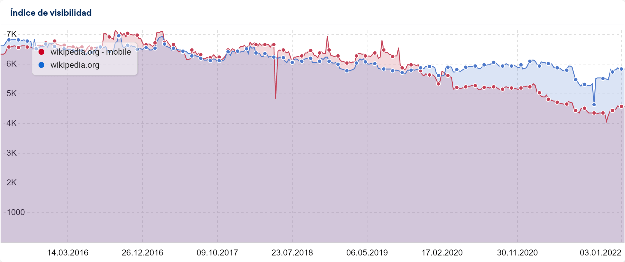 El futuro ya se puede ver a día de hoy en el teléfono móvil. Todas las funcionalidades importantes de las SERPs de los últimos años se han mostrado primero en las SERPs para móviles y más tarde, incluso a veces con mucho retraso, se mostraron también en los resultados de búsqueda para escritorio. Y, en este sentido, el futuro no augura nada bueno, como se puede ver en la comparación de la visibilidad de wikipedia.org para escritorio con la visibilidad para móvil en la búsqueda en España: